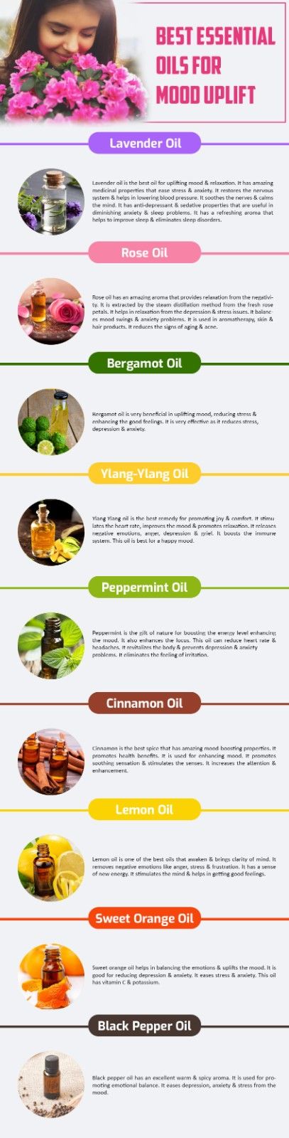 - Lavender Oil: Lavender oil is the best oil for uplifting mood & relaxation. It has amazing medicinal properties that ease stress & anxiety. It restores the nervous system & helps in lowering blood pressure. It soothes the nerves & calms the mind. It has anti-depressant & sedative properties that are useful in diminishing anxiety & sleep problems. It has a refreshing aroma that helps to improve sleep & eliminates sleep disorders.