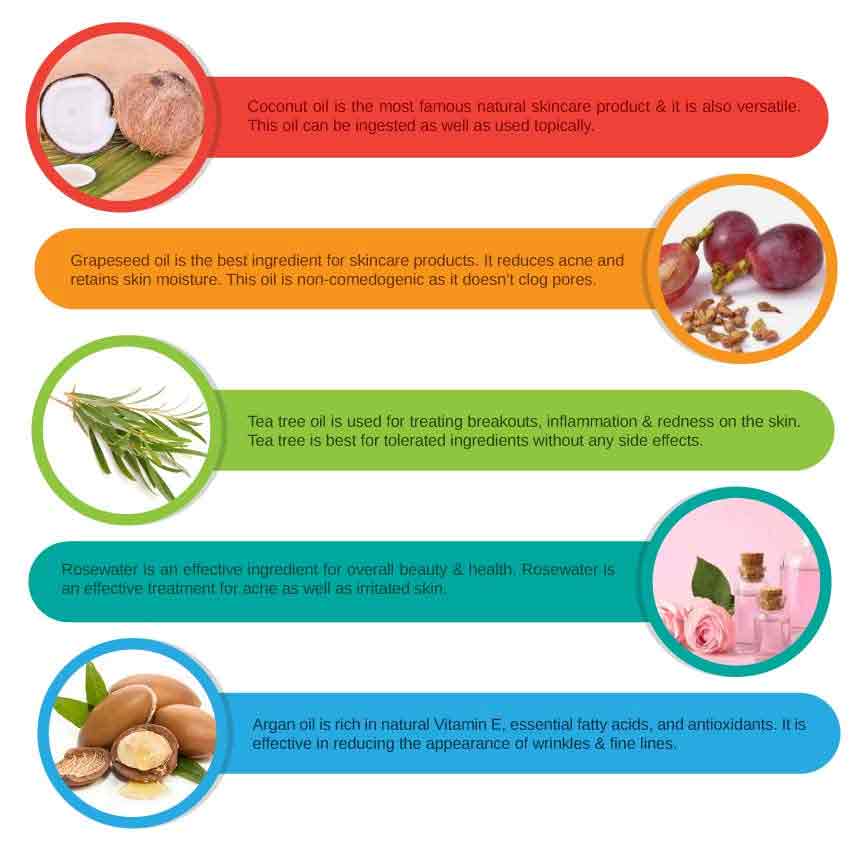 Grapeseed oil is the best ingredient for skincare products. It reduces acne and retains skin moisture. This oil is non-comedogenic as it doesn't clog pores & can be used on sensitive skins. It is also used as an eye cream as an alternative for lightening dark circles. It is a widely used moisturizer for skin that is prone to acne.