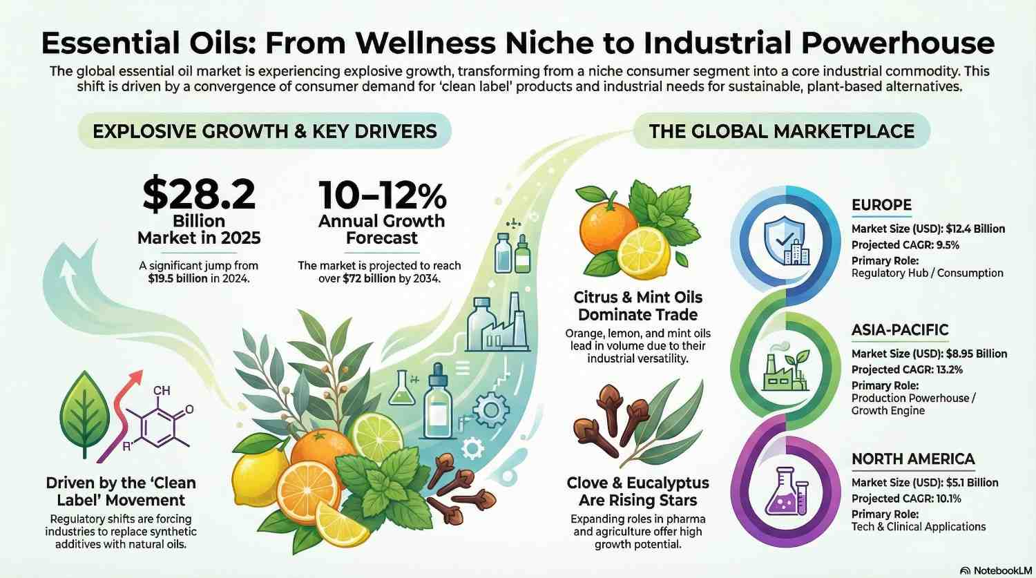 Looking ahead, the market is projected to maintain a steady CAGR of 10–12%. Demand is primarily insulated by the "Clean Label" movement and a permanent shift toward natural wellness in mature economies. Europe remains the global leader in both consumption and regulatory standards, while the Asia-Pacific region serves as the primary engine for production and emerging demand. High-liquidity oils—specifically citrus (orange/lemon), mint, and eucalyptus—continue to dominate trade volumes due to their versatility in flavoring and therapeutic applications.