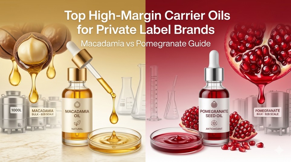 If macadamia oil is the scalable luxury base, pomegranate seed oil is its high-value counterpart — a functional active that commands ultra-premium pricing, carries exceptional clinical credibility, and operates in a category where competition remains genuinely low. For private label brands that understand how to use it, pomegranate seed oil is one of the most powerful margin tools available in the botanical oil market.